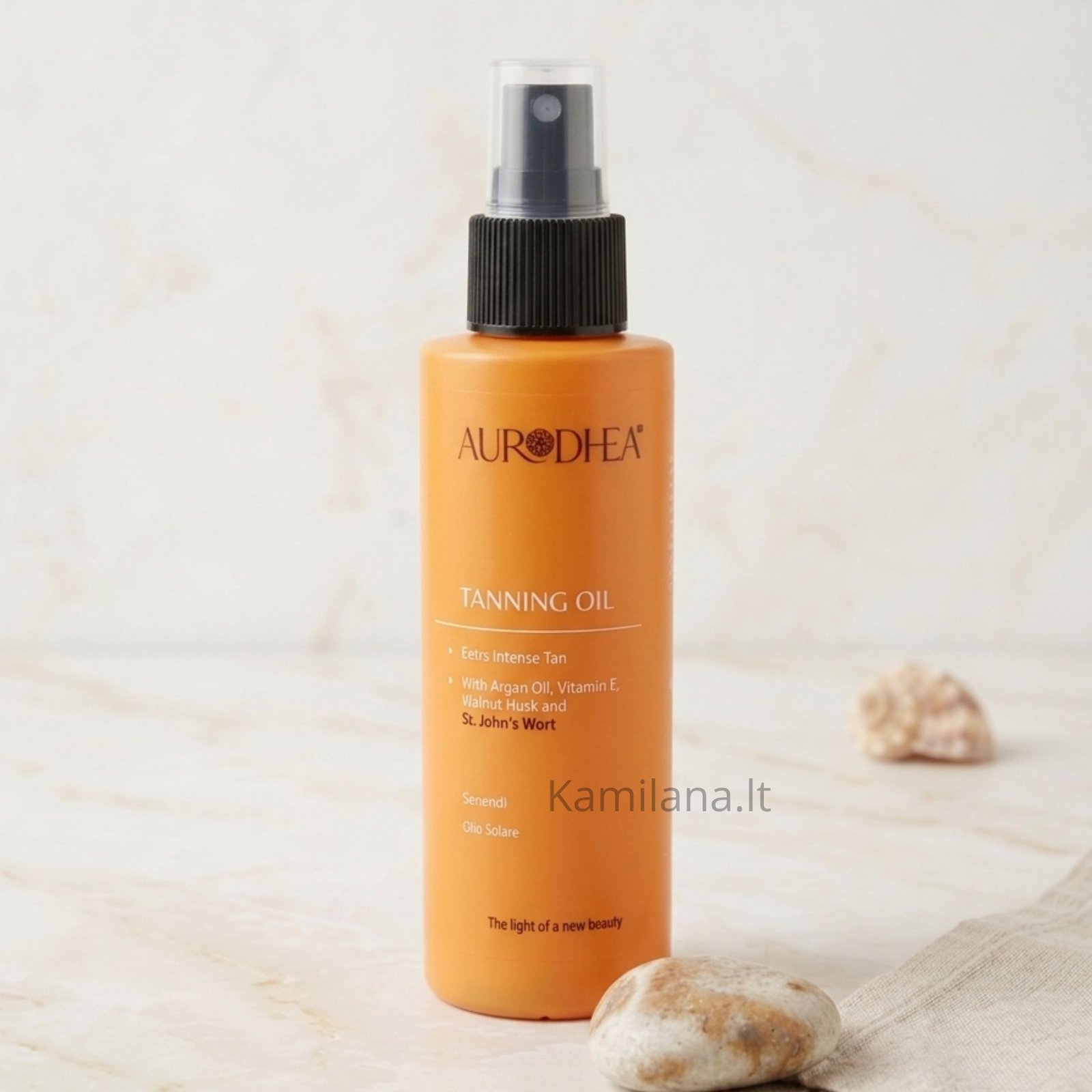 „Aurodhea“ įdegį skatinantis aliejus su jonažolėmis ir graikinių riešutų lukštais – jūsų sąjungininkas, siekiant intensyvaus, auksinio įdegio. Pažangi formulė skatina įdegio formavimąsi nepažeidžiant odos. Graikinių riešutų lukštų ekstraktas ne tik padeda odai įdegti, bet ir suteikia apsaugą. Natūralus karotino ir flavonoidų „rezervuaras“, reaguojantis su epidermyje esančiu keratinu, sudaro rudą pigmento kompleksą. Jonažolė, pasižyminti minkštinamosiomis savybėmis, padeda suteikti auksinį įdegį, išlaikant odą sveiką ir švelnią. Galiausiai, argano aliejus, vitaminas E ir saldžiųjų migdolų aliejus pasižymi maitinamuoju, antioksidaciniu ir elastingumą didinančiu poveikiu.